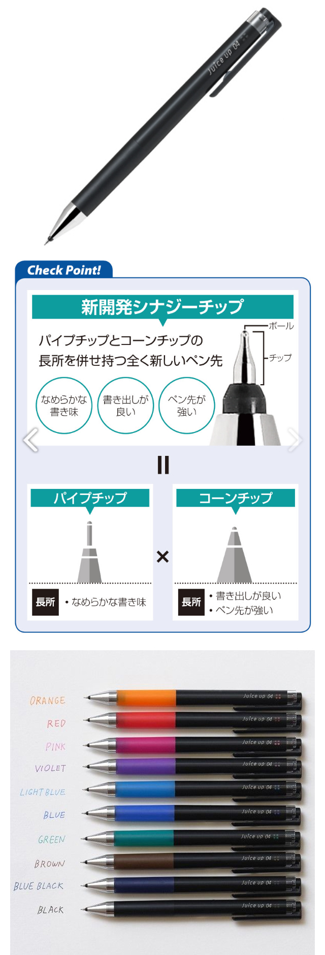 🔹 상세 정보 원재료: ・원산지: 일본 ・펜촉: 시너지 팁(Synergy Tip) ・볼 지름: 0.4mm(초극세) ・잉크 색상: 블랙 ・타입: 노크식 ・크기: 최대지름 φ10.5mm / 전장 약 143mm