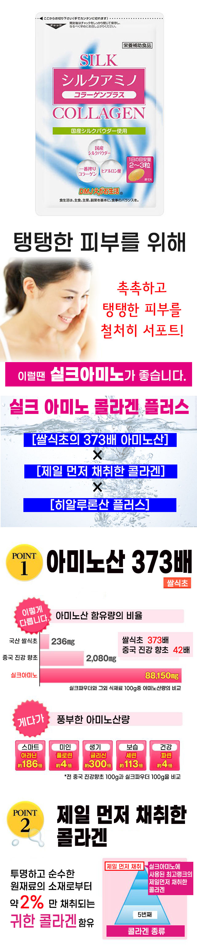 실크 단백질 천잠 실크 아미노산이란? BC 3000년전 중국에서 처음 비단이 만들어진 이후 의복이나 가식용, 술안주용으로 애용되어왔던 누에고치가 허준의 동의보감에 의하면 여러 질환의 치료 및 예방에 쓰여 왔음을 알 수 있다. 누에는 허준의 동의보감에서 음수증(당뇨병)의 치료제로 기록되어 있을 뿐만 아니라 예로부터 한의학과 민간요법 중에서 당뇨예방 및 피로 회복, 피부 노화방지, 기억상실증(치매)에 효과가 있다고 알려져 있다. 실크 펩타이드와 효능 실크 펩타이드는 인체 단백질의 구성요소인 다양한 아미노산과 그 아미노산의 결합체가 혼재된 물질로 높은 생리활성을 나타낸다. 생리적 활성은 함유한 아미노산의 종류와 결합형태에 따라 다양하게 나타난다. 체지방분해와 신체 balance 유지에 도움을 준다. Leptin을 증가시킨다. Leptin 이란? 뇌의 포만중추를 자극하는 호르몬(식욕조절인자)은 발열반응과 활동량을 증가시키고 섭취량을 감소시켜 결과적으로 체중과 체지방량을 감소시킨다. 실크 아미노산의 효능 알라닌 -간 기능을 활성화하여 숙취의 예방 및 해독에 탁월한 효과 생체내의 인슐린 분비를 촉진하여 혈당량을 낮추는 효과 글리신과 세린 -혈 중 콜레스테롤 농도를 저하시켜 고혈압이나 뇌졸증의 예방 티로신 -노인성 치매의 예방 및 치료에 효능 그러나 실크 자체를 먹는다면 체내에서 소화, 흡수되지 않기 때문에 견섬유의 단백질을 분해하여 흡수하기 쉬운 상태로 만드는 일련의 과정이 필요하며 이러한 과정을 거친 실크아미노산은 90% 이상의 높은 소화 흡수율을 나타낸다. 실크 아미노산의 효능/가치 ・당뇨의 예방 및 치료 ・혈중 콜레스테롤 저하 : 항고혈압, 항뇌졸중 ・간 기능 강화 및 숙취해소 ・유아 및 아동기 성장발육, 두뇌개발 ・폐경이후 골다공증, 퇴행성 관절 예방 ・노인성 치매예방 ・피부미용 ・에너지, 스태미너 증강 ・체지방분해와 신체 balance유지 ・Leptin 증가 [제일 처음 채취된 콜라겐 사용] 처음 채취한 콜라겐은 통산 수회에 걸쳐 행해지는 콜라겐 추출시에 가장 먼저 추출된 고순도의 성분을 말합니다. 등급으로는 제일 좋은 특별 랭크! 특별한 콜라겐입니다 본제품에 사용되고 있는 [제일 처음 채취한 콜라겐]은 특별 랭크 콜라겐 순도가 상당히 높고 고품질이 것이 특징입니다 원재료에서 약 2%밖에 채취할 수 없는 특별한 콜라겐입니다. <성분/함량> 원재료; 실크 파우더, 올리브 오일, 포도씨오일, 해바라기씨유, 콜락라겐 펩티드, 글리세린지방산에스텔, 밀납, 히알루론산 *쌀, 대두는 사용하지 않았습니다. *주력 성분은 천잠 유래의 실크 아미노산의 제일 처음 채취한 콜라겐, 히알루론산입니다. <용법/용량> 1일 2-3정 |