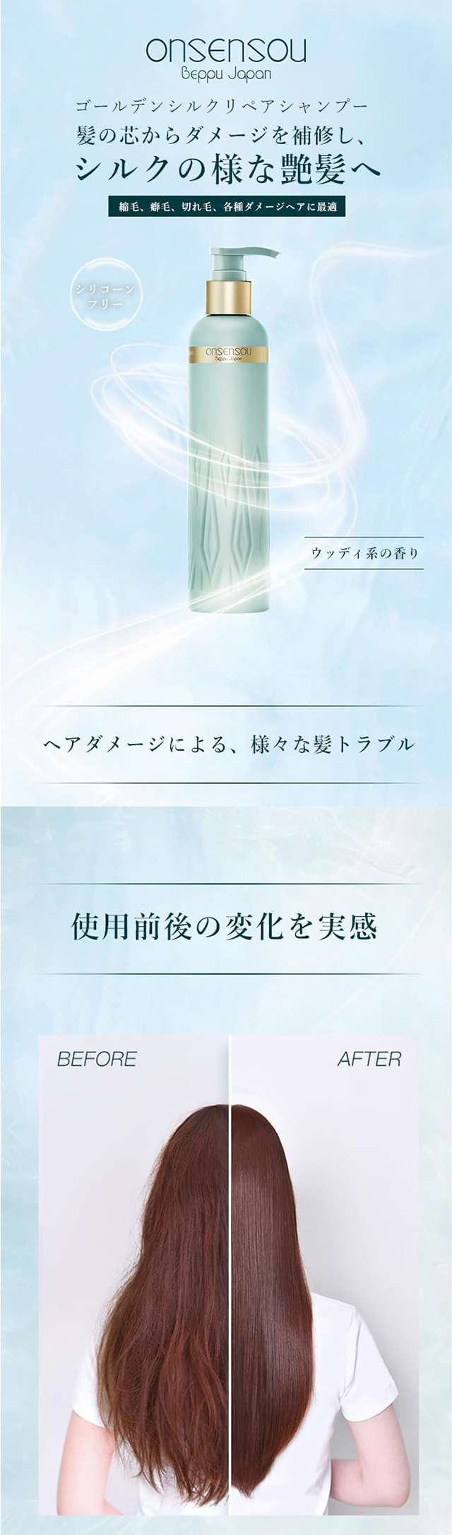 - home > 뷰티/화장품 > 헤어/두피/육모 > 샴푸/트리트먼트 > ONSENSOU 온센소우 벳푸 온천 조류 함유 골든 실크 리페어 집중 케어 샴푸 250ml