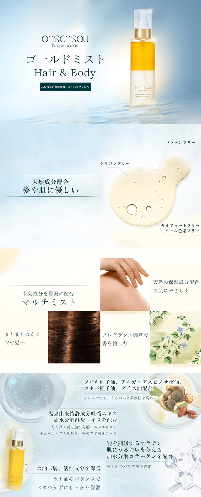 - home > 뷰티/화장품 > 헤어/두피/육모 > 헤어오일/크림/미스트 > ONSENSOU 온센소우 벳푸 온천 조류 함유 골드 미스트 헤어 & 바디 95ml