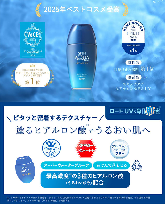 자외선으로 인한 건조 데미지로부터 피부를 보호하면서, 촉촉함이 오래 지속되는 수분 세럼 타입 선케어입니다. 에탄올 프리 처방으로 민감한 피부에도 부담 없이 사용할 수 있으며, 3종 히알루론산을 함유해 바르는 순간부터 촉촉하고 쫀쫀한 피부로 가꿔줍니다. 메이크업 전 화장 베이스 겸용으로도 활용 가능한 데일리 UV 제품입니다. 🔹 상세 정보 ・내용량: 70g ・품목명: 자외선 차단제 (얼굴·전신용) ・패키지 크기: 약 20.5 × 10 × 3.8cm ・원재료: 정제수, 자외선 차단 성분, 히알루론산Na, 초저분자 히알루론산, 피부흡착형 히알루론산 등 ・원산지: 일본 🔹 보관방법 고온·저온 및 직사광선을 피해 밀봉 보관해 주세요. 영유아의 손이 닿지 않는 곳에 보관하십시오. 🔹 정보 색상 / 제형 설명 → 무색 투명 · 젤 타입 / 백탁 없이 산뜻하게 스며드는 수분 세럼 제형 감성 요약 → 물처럼 가볍게, 세럼처럼 촉촉한 데일리 수분 UV 🔹 특징 ・SPF50+ PA++++ 강력한 자외선 차단 ・에탄올 프리 / 무향 / 무착색 / 파라벤 프리 ・3종 히알루론산 함유로 장시간 보습 지속 ・가볍고 산뜻한 젤 타입, 끈적임 없음 ・메이크업 전 베이스용으로도 사용 가능 ・2025년 VOCE UV 베스트 코스메 플치프라 UV 부문 1위 ⚠️ 주의사항 ・피부에 상처, 습진 등 이상이 있는 부위에는 사용하지 마십시오. ・사용 중 또는 사용 후 붉어짐, 가려움, 자극 등의 이상이 나타날 경우 사용을 중지하고 전문의와 상담하십시오. ・눈에 들어가지 않도록 주의하시고, 들어간 경우 즉시 씻어내십시오. ・의류에 묻을 경우 착색되거나 잘 지워지지 않을 수 있으니 주의 바랍니다. ・개인의 피부 상태에 따라 자극이 발생할 수 있습니다.