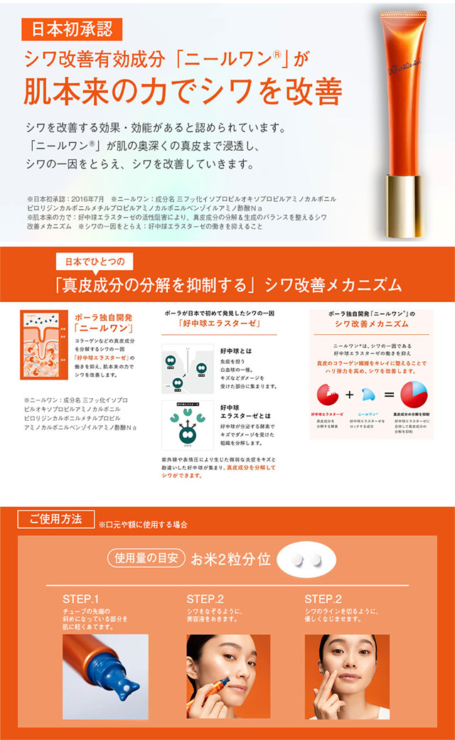 일본 폴라의 대표 주름 케어 미용액으로, 의약외품 인증을 받은 기능성 주름 개선 세럼입니다. 매끄럽고 탄력 있는 피부로 가꾸어 줍니다.
