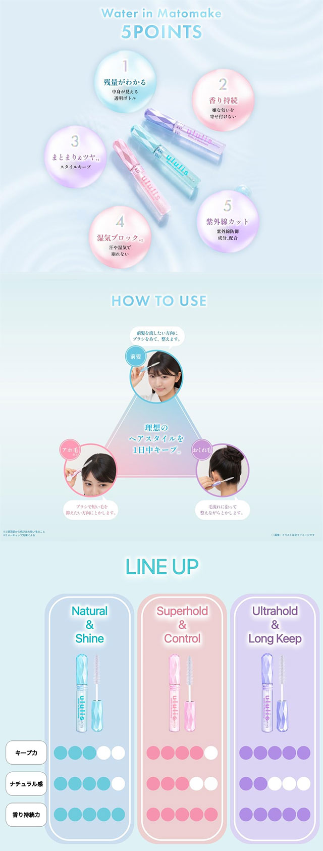 잔머리·부스스한 모발·앞머리 흐트러짐을 간편하게 정돈하는 워터 베이스 헤어 정리 스틱. 휴대가 간편해 언제 어디서나 깔끔한 스타일을 유지할 수 있습니다.