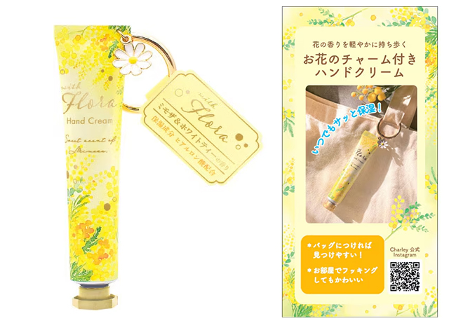 꽃 참 장식과 원형 카라비너가 포함된 슬림 타입 핸드크림. 퍼지는 한정판 아이템입니다.