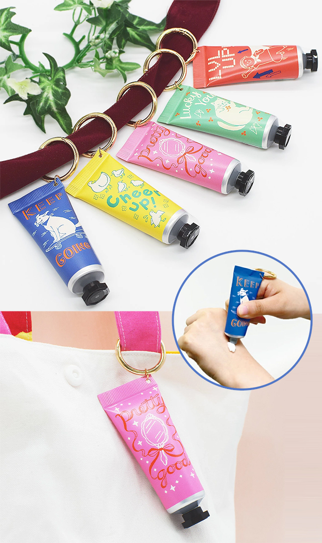 원형 카라비너가 포함된 핸드크림으로 가방이나 파우치에 걸어 포인트 아이템으로 연출 가능.