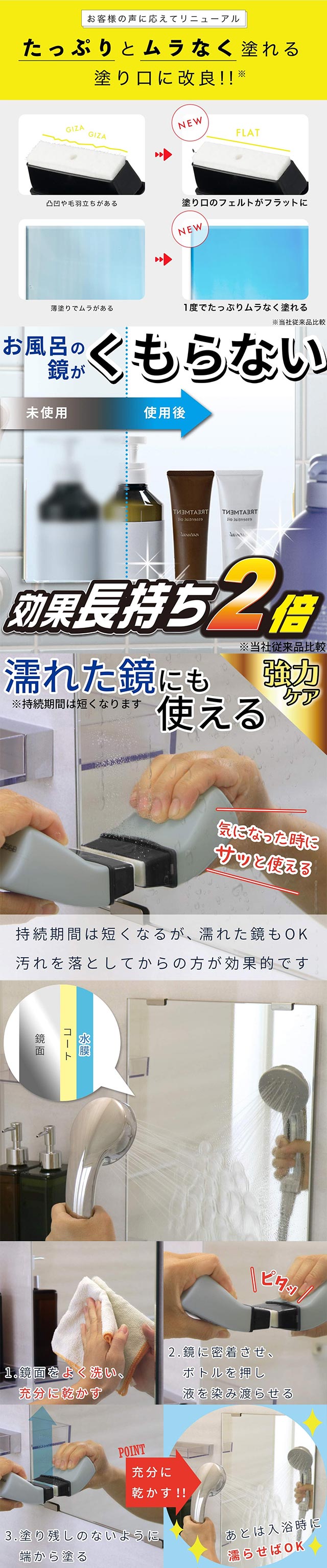욕실 거울의 김서림을 방지하고 오염까지 막아주는 강력 코팅 타입 리퀴드. 젖은 거울에도 사용 가능한 액상 타입으로 기존 제품 대비 약 2배 오래 지속되며, 방오 코팅 효과까지 더해 욕실 거울을 선명하게 유지해줍니다. 겹쳐 바르기 가능하며 곡선형 헤드로 쉽고 균일하게 도포할 수 있습니다. 🔹 상세 정보 ・내용량: 80ml ・품목명: 거울 김서림 방지 코팅제 ・패키지 크기: 약 7 × 5 × 9.5cm ・원재료: 물, 다가알코올, 실리카, 계면활성제 ・원산지: 일본 🔹 보관방법 직사광선을 피하고 고온다습한 장소를 피해 보관하십시오. 어린이 손이 닿지 않는 곳에 보관하세요. 🔹 정보 ・액상 색상: 투명 → 거울에 자국 없이 깔끔하게 코팅되는 투명 리퀴드 타입 🔹 특징 ・욕실 거울 김서림 방지 + 방오 코팅 효과 ・기존 제품 대비 약 2배 지속력 ・젖은 거울에도 사용 가능한 리퀴드 타입 ⚠️ 주의사항 ・용도 외 사용을 피하고 어린이 손이 닿지 않게 보관하세요. ・사용 후 눈이나 피부에 닿았을 경우 즉시 물로 씻어주세요. ・거울 외 민감한 표면에는 테스트 후 사용하세요.