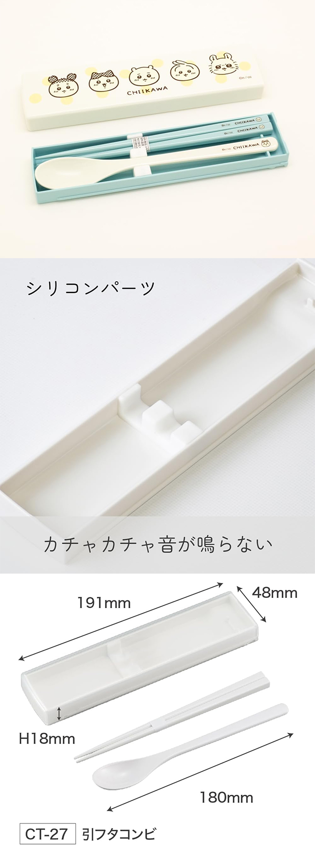 귀여운 치이카와 디자인의 일본제 항균 젓가락·스푼 세트입니다. 실리콘 파츠가 있어 소음 없이 사용할 수 있으며, 슬라이드식 케이스로 휴대와 사용이 편리한 데일리 도시락 커트러리 세트입니다. 🔹 상세 정보 ・내용량: 젓가락 18cm + 스푼 + 케이스 ・품목명: 젓가락·스푼 커트러리 세트 ・패키지 크기: 케이스 약 48×191×18mm ・원재료: - 케이스·스푼: ABS수지 - 뚜껑: AS수지 - 젓가락: PMMA ・원산지: 일본 🔹 보관방법 고온다습 및 직사광선을 피해 보관 🔹 정보 ・색상명: 치이카와 캐릭터 디자인 → 감성 요약: 귀여운 치이카와 감성으로 도시락 시간을 더욱 즐겁게 만드는 데일리 커트러리 세트 🔹 특징 ・젓가락(18cm)과 스푼 구성의 2종 커트러리 세트 ・실리콘 파츠 포함으로 이동 시 소음 최소화 ・슬라이드식 케이스로 간편한 개폐 ・항균 가공 처리로 위생적인 사용 ・식기세척기 사용 가능 ⚠️ 주의사항 ・화기 및 고온 환경에서 사용·보관 금지 ・강한 충격 시 파손될 수 있으므로 주의 ・사용 후 세척 및 완전 건조 후 보관 ・항균 가공은 모든 세균을 완전히 제거하는 것은 아님