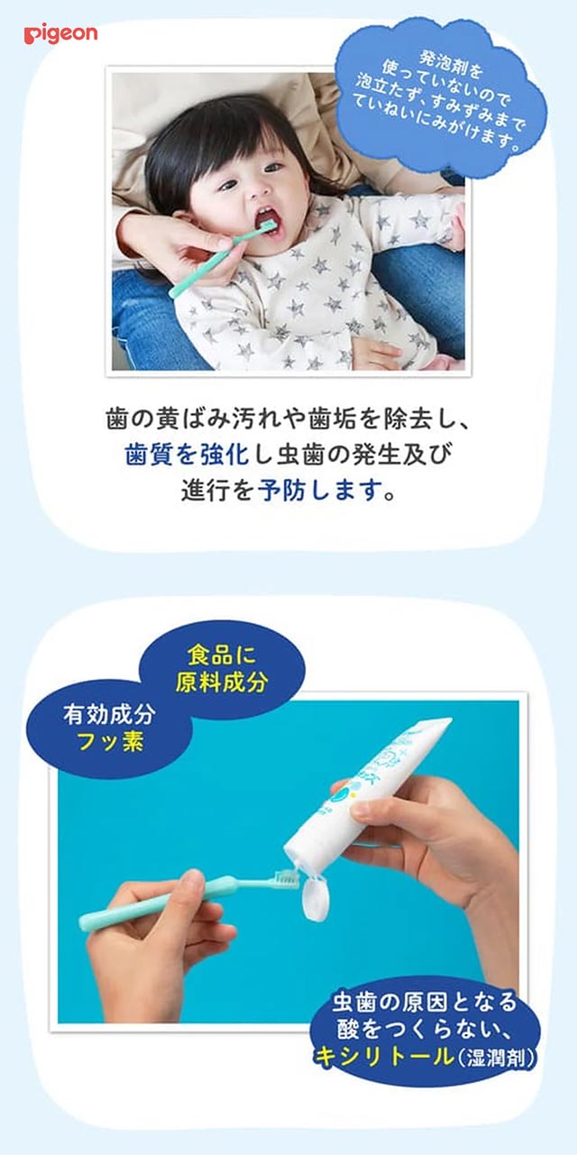 이유식이 진행되는 12개월 무렵부터 사용 가능한 유아용 약용 젤 치약입니다. 아이가 다양한 음식을 먹기 시작하면 충치 위험도 함께 증가합니다.