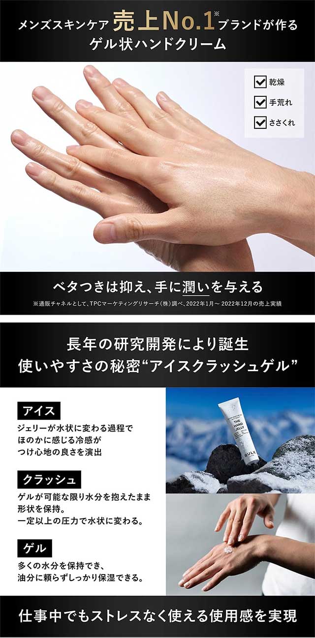 스킨케어 발상에서 탄생한 남성용 핸드 보습 젤로, 손에 바르면 물처럼 스며드는 젤 텍스처가 끈적임 없이 촉촉한 보습을 유지합니다. 수분을 공급하여 건조한 손을 산뜻하게 케어합니다.