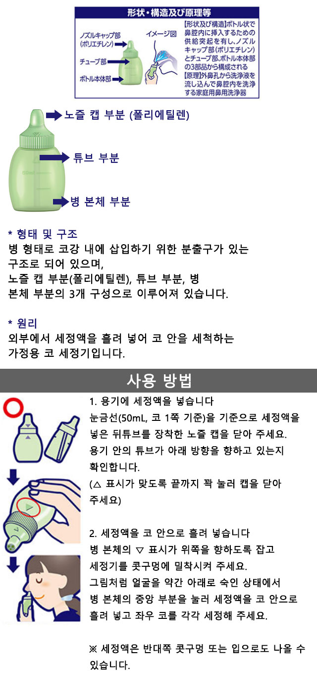 ※ 세정액은 반대쪽 콧구멍 또는 입으로도 나올 수 있습니다. 하루 1~3회 사용을 권장합니다.