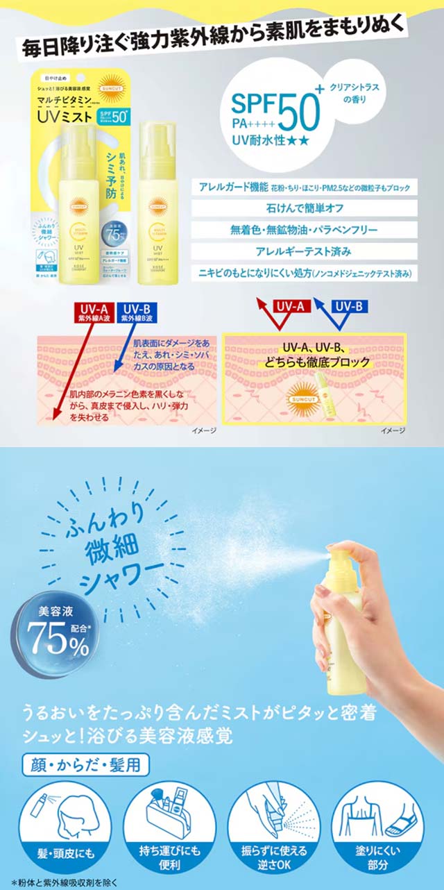 얼굴, 몸, 머리카락까지 간편하게 사용할 수 있는 멀티비타민 UV 미스트입니다. 가볍게 분사되는 미스트 타입으로 언제 어디서나 손쉽게 자외선 차단과 덧바르기가 가능합니다.