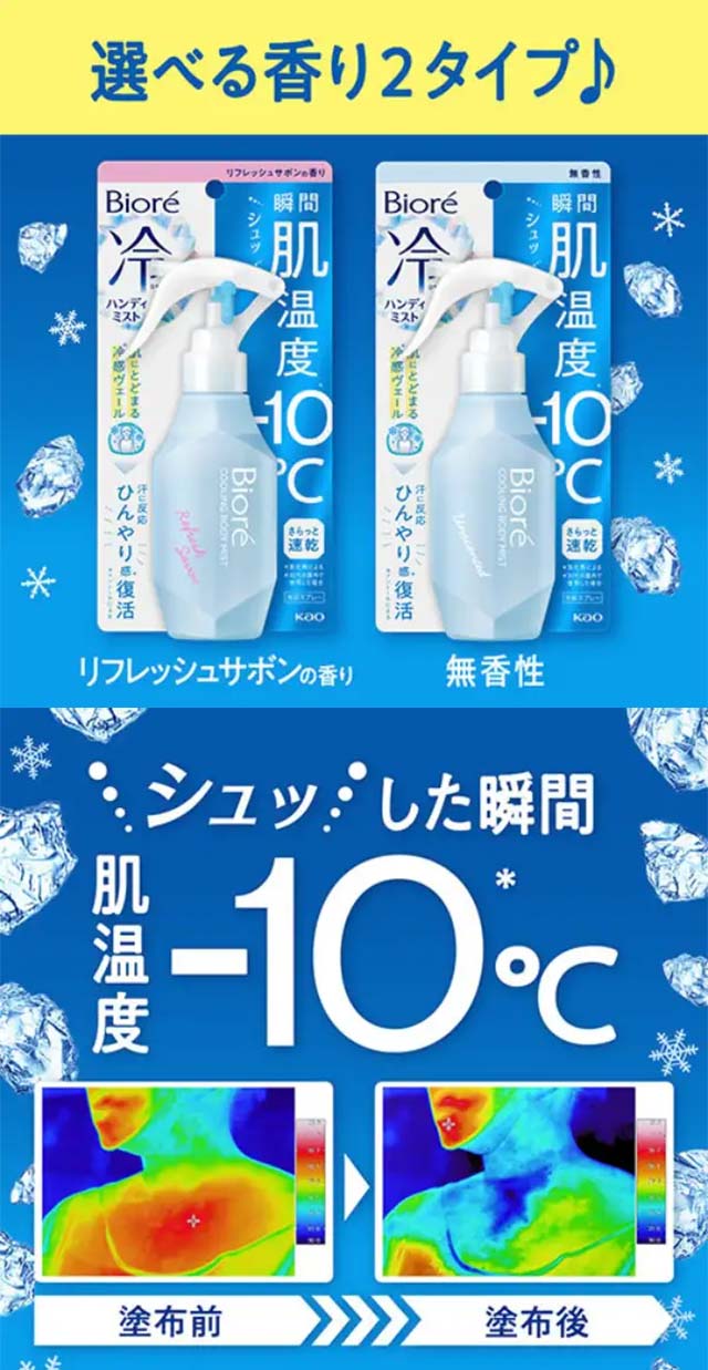 더위를 느끼는 순간 피부에 뿌리면 즉시 시원함을 주는 쿨링 미스트. 미세 안개 미스트가 피부 열을 빠르게 식혀주고 땀에 반응해 상쾌한 쿨링감을 유지합니다. 🔹 상세 정보 ・내용량: 120mL ・품목명: 바디 쿨링 미스트 ・형태: 스프레이 타입 ・향: 리프레시 사봉 향 ・원산지: 일본 🔹보관방법 직사광선을 피하고 고온의 장소에 보관하지 마십시오. 🔹 정보 ・리프레시 사봉 향 (상쾌하고 깨끗한 비누 향) → 더운 날에도 상쾌하게 리프레시되는 쿨링 미스트 🔹 특징 ・피부에 분사하는 순간 피부 온도 약 -10℃ 쿨링 효과 ・미세 미스트가 피부 열을 빠르게 흡수해 즉각적인 시원함 ・땀에 반응해 멘톨 성분이 다시 쿨링감 제공 ・속건성 처방으로 옷이 젖는 느낌 없이 사용 가능 ⚠️ 주의사항 ・눈이나 점막 부위에는 사용하지 말고 피부에 이상이 있을 경우 사용을 중지하십시오. ・직사광선이나 고온 장소를 피해 보관하고 어린이 손이 닿지 않는 곳에 보관하십시오.