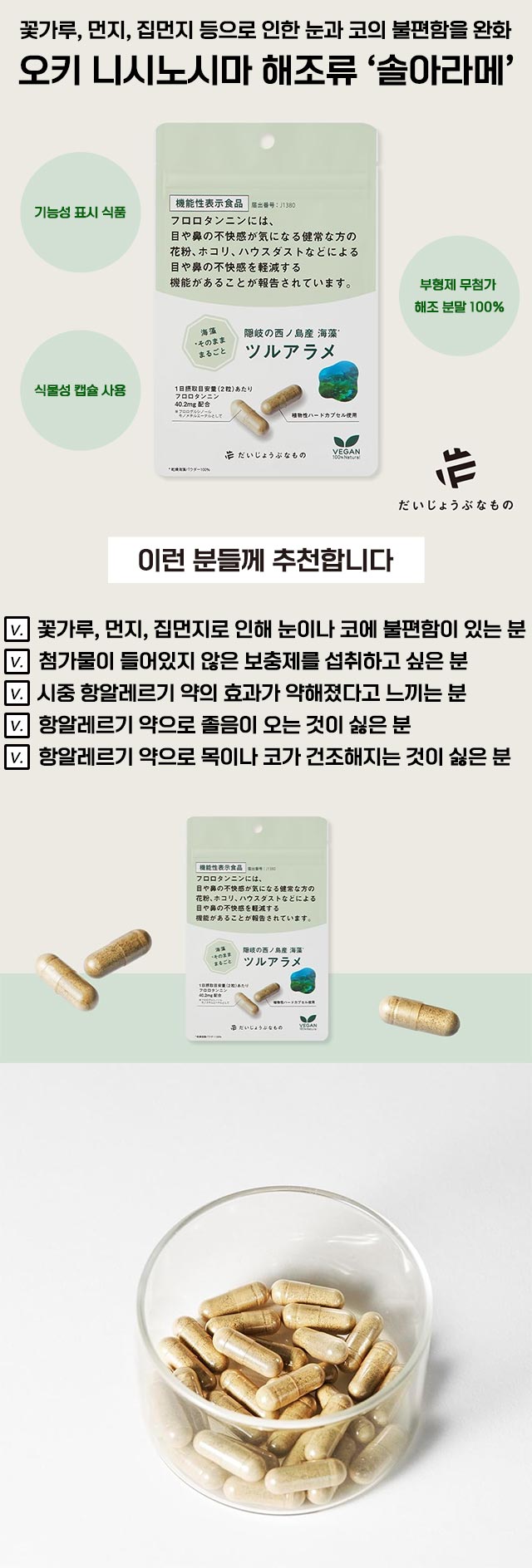 시마네현 오키 니시노시마에서 채취한 해조류 ‘츠루아라메’를 사용한 기능성 표시 식품 서플리먼트입니다. 해조 폴리페놀 성분인 ‘플로로탄닌’을 함유하여 꽃가루, 먼지, 집먼지 등으로 인한 눈과 코의 불편함 완화에 도움을 줄 수 있는 건강 보조 식품입니다. 🔹 상세 정보 ・내용량: 60정 (약 1개월분) ・품목명: 기능성 표시 식품(해조류 서플리먼트) ・패키지 크기: 약 12.1 × 10.6 × 1.3cm ・원재료: 츠루아라메 건조 분말(시마네현 니시노시마 제조), 풀란 ・원산지: 일본 🔹복용 방법 츠루아라메는 해조 100%라서 요오드(요소) 함량이 걱정되는데 괜찮을까요? 본 제품은 해조를 그대로 분말로 만든 제품이기 때문에 요오드(요소)를 소량 함유하고 있습니다. 츠루아라메 1정에 포함된 요오드 함량은 최대 1,005μg(마이크로그램) 입니다. 임산부나 수유 중인 여성의 경우 하루 섭취 가능한 요오드 양은 2,000μg으로 알려져 있습니다. 연령에 따라 권장 섭취량이 다르므로 아래 표를 참고하여 섭취해 주세요. 🔹연령 섭취량 3~5세 : 0.3정 6~7세 : 0.4정 8~9세 : 0.5정 10~11세 : 0.7정 12~14세 : 1정 15~17세 : 2정 18세 이상 : 2정 ※ 아이에게 먹이는 추천 방법이 있나요? 츠루아라메 해조 분말은 그대로 섭취하면 약간의 떫은맛이 있을 수 있습니다. 맛이 진한 된장국 등에 섞어 섭취하면 잘 어울립니다. 🔹 보관방법 직사광선 및 고온다습한 장소를 피해 서늘한 곳에 보관해 주세요. 🔹 정보 ・해조 폴리페놀 ‘플로로탄닌’ 함유 기능성 표시 식품 → 꽃가루·먼지·집먼지 등으로 인한 눈과 코의 불편함 완화에 도움 🔹 특징 ・시마네현 오키 니시노시마산 해조류 ‘츠루아라메’ 사용 ・해조 폴리페놀 ‘플로로탄닌’ 함유 ・첨가물 없이 해조 분말 100% 캡슐 ・식물성 캡슐 사용, 비건·베지테리언 섭취 가능 ⚠️ 주의사항 ・1일 권장 섭취량을 준수해 주세요. ・과다 섭취 시 건강 증진 효과가 더 높아지는 것은 아닙니다. ・체질이나 섭취량에 따라 복부 불편이나 묽은 변이 발생할 수 있습니다. ・본 제품은 의약품이 아니며 질병의 치료 또는 예방을 목적으로 한 제품이 아닙니다.