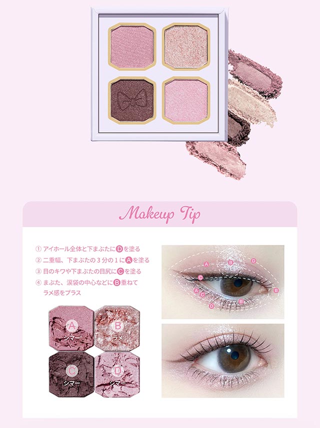 귀여운 고양이에서 영감을 받아 만든 마이 키티 아이팔레트로, 디즈니 캐릭터 마리 패키지가 특징인 4색 아이섀도 팔레트입니다. 마리의 상징인 리본 모양이 팔레트에 각인되어 있으며, 부드러운 컬러와 라메 조합으로 자연스럽고 사랑스러운 아이 메이크업을 연출할 수 있습니다. 🔹 상세 정보 ・내용량: 3.2g ・품목명: 아이섀도 팔레트 (4색) ・패키지 크기: 약 68 × 68 × 16 mm 🔹 정보 ・부드러운 베이지·핑크 톤 컬러 조합 → 자연스럽고 화사한 눈매를 연출하는 아이섀도 🔹 특징 ・디즈니 마리 캐릭터 패키지 디자인 ・고양이에서 영감을 받은 컬러 팔레트 ・라메 컬러로 포인트 메이크업 연출 가능 ・컴팩트 사이즈로 휴대 및 수정 메이크업 편리 ⚠️ 주의사항 ・피부에 맞지 않을 경우 사용을 중지하십시오. ・눈에 들어가지 않도록 주의하십시오. ・사용 후에는 뚜껑을 닫아 청결하게 보관하십시오. ・직사광선 및 고온다습한 곳을 피해 보관하십시오.