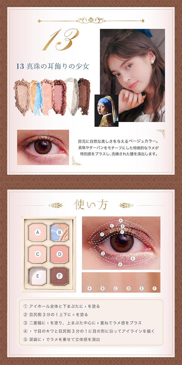 명화에서 영감을 받아 제작된 밀피 명화 아이섀도 팔레트로, 부드러운 파우더 텍스처가 피부에 자연스럽게 밀착되어 우아한 아이 메이크업을 연출할 수 있습니다. 세계적인 명화 ‘진주 귀걸이를 한 소녀’를 모티브로 한 디자인으로 예술적인 감성을 담은 메이크업 아이템입니다. 🔹 상세 정보 ・내용량: 6g ・품목명: 아이섀도 팔레트 (6색) ・패키지 크기: 약 67 × 11 × 94 mm 🔹 정보 ・베이지·브라운 계열 컬러 조합 → 자연스럽고 우아한 눈매를 연출하는 아이섀도 🔹 특징 ・명화에서 영감을 받은 아트 콘셉트 아이섀도 팔레트 ・부드러운 파우더 텍스처로 자연스럽게 밀착 ・다양한 펄과 글리터로 반짝이는 아이 메이크업 연출 ・책 형태의 북 타입 패키지로 소장 가치 높은 디자인 ⚠️ 주의사항 ・피부에 맞지 않을 경우 사용을 중지하십시오. ・눈에 들어가지 않도록 주의하십시오. ・사용 후에는 뚜껑을 닫아 청결하게 보관하십시오. ・직사광선 및 고온다습한 곳을 피해 보관하십시오.