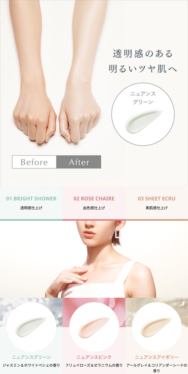 고휘도 멀티 컬러 펄이 피부 톤의 불균형으로 생기는 그림자를 자연스럽게 보정하여 맑고 투명한 윤광 피부로 연출해 주는 톤업 선 젤입니다. 끈적임 없이 산뜻한 사용감으로 자연스러운 맨피부 느낌을 살려주며, 얼굴과 바디 모두 사용 가능합니다. 얼그레이 & 코리앤더 씨드 향이 은은하게 퍼지는 제품입니다. 🔹 상세 정보 ・내용량: 60g ・품목명: 자외선 차단제 (얼굴·바디용) ・원재료: 물, 산화아연, 에탄올, 글리세린, 산화티타늄, 디메치콘, 히알루론산Na 등 ・원산지: 일본 🔹보관방법 ・직사광선을 피해 서늘한 곳에 보관하세요. ・고온·저온의 장소를 피해 보관하세요. ・어린이의 손이 닿지 않는 곳에 보관하세요. 🔹 정보 ・멀티 컬러 펄로 피부 톤을 자연스럽게 보정 → 맑고 투명한 윤광 피부 톤업 선젤 🔹 특징 ・SPF50+ / PA++++ 강력한 자외선 차단 ・슈퍼 워터프루프 & 프릭션 프루프 기능 ・땀·물·마찰에 강한 지속력 ・미세먼지, PM2.5, 꽃가루 등의 미세 입자 부착 방지 ⚠️ 주의사항 ・상처, 붓기, 습진 등 피부 이상이 있는 부위에는 사용하지 마세요. ・사용 중 붉어짐, 가려움, 자극 등의 이상이 나타나면 사용을 중지하고 전문가와 상담하세요. ・눈에 들어가지 않도록 주의하고 들어갔을 경우 충분히 씻어내세요. ・의류 등에 묻지 않도록 주의하고 묻었을 경우 즉시 세탁하세요.