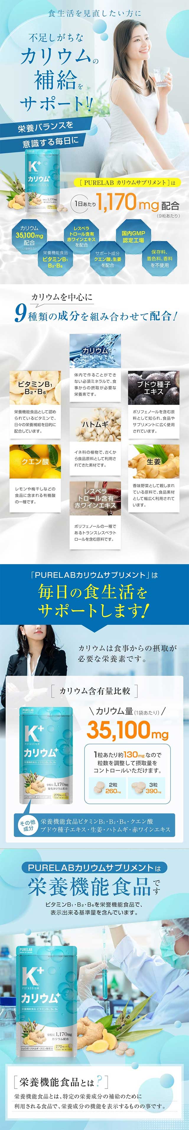 칼륨(염화칼륨)과 레스베라트롤을 중심으로, 비타민B군과 다양한 식물 유래 성분을 함께 배합한 종합 건강 서플리먼트입니다. 균형 잡힌 성분 설계로 일상 컨디션 관리에 도움을 주는 제품입니다. 🔹 상세 정보 ・내용량: 270정 (약 30일분) ・품목명: 영양보조식품 (비타민 B1·B2·B6 영양기능식품) ・패키지 크기: 약 19.6 x 10.6 x 1.8cm ・원재료: 환원맥아당, 포도씨 추출물, 율무 추출물, 생강 분말, 레스베라트롤 함유 적포도주 추출물, 염화칼륨, 셀룰로오스, 스테아린산Ca, 이산화규소, 비타민B1·B2·B6, 구연산 등 ・원산지: 일본 🔹 보관방법 ・직사광선을 피해 서늘하고 건조한 곳에 보관 ・어린이의 손이 닿지 않는 곳에 보관 ・개봉 후에는 밀봉하여 보관 ・습기 및 고온을 피해 보관 🔹 복용방법 ・1일 2~3정을 기준으로 물과 함께 섭취 ・씹지 말고 그대로 삼켜서 섭취 ・섭취량은 필요에 따라 조절 가능 (1정 약 130mg 기준) ・식사 전후 관계없이 섭취 가능 🔹 정보 ・타블렛 타입 / 데일리 건강 관리에 적합 → 가볍게 시작하는 밸런스 케어 서플리먼트 🔹 특징 ・1일 기준 칼륨(염화칼륨) 1,170mg 함유 ・레스베라트롤 & 포도씨 추출물(폴리페놀) 배합 ・비타민 B1·B2·B6 영양기능식품 ・생강, 율무, 구연산 등 식물 유래 성분 추가 🔹 이 제품은 뭐에 좋은가? 1. 붓기 & 체내 밸런스 관리 → 칼륨(염화칼륨) 나트륨 배출 도움 몸이 자주 붓는 사람, 짠 음식 많은 식습관에 추천 “부종 케어 / 라인 관리” 포인트 2. 항산화 & 노화 케어 → 레스베라트롤 + 폴리페놀 활성산소 억제 피부·컨디션 유지 “안티에이징 / 피로 누적 케어” 3. 에너지 & 피로 회복 → 비타민 B1·B2·B6 에너지 생성 도움 피로감, 무기력 개선 “활력 / 데일리 에너지 케어” 4. 순환 & 컨디션 관리 → 생강 + 구연산 + 율무 몸을 따뜻하게 순환 케어 “몸이 무겁고 찌뿌둥할 때” 🔹 한 줄 정리 → “붓기 케어 + 항산화 + 활력까지 한 번에 관리하는 데일리 밸런스 서플리먼트” ⚠️ 주의사항 ・알레르기 체질인 경우 원재료 확인 후 섭취 ・체질에 맞지 않을 경우 섭취 중단 ・약 복용 중 또는 치료 중인 경우 전문가 상담 후 섭취 ・임신·수유 중인 경우 의사 상담 후 섭취