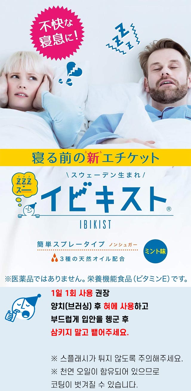 3가지 천연 오일과 비타민 E 함유(노슈가)로 간편한 스프레이 타입으로 언제 어디서나 손쉽게 사용 가능하며, 숨 쉴 때 불쾌함이 느껴질 때,