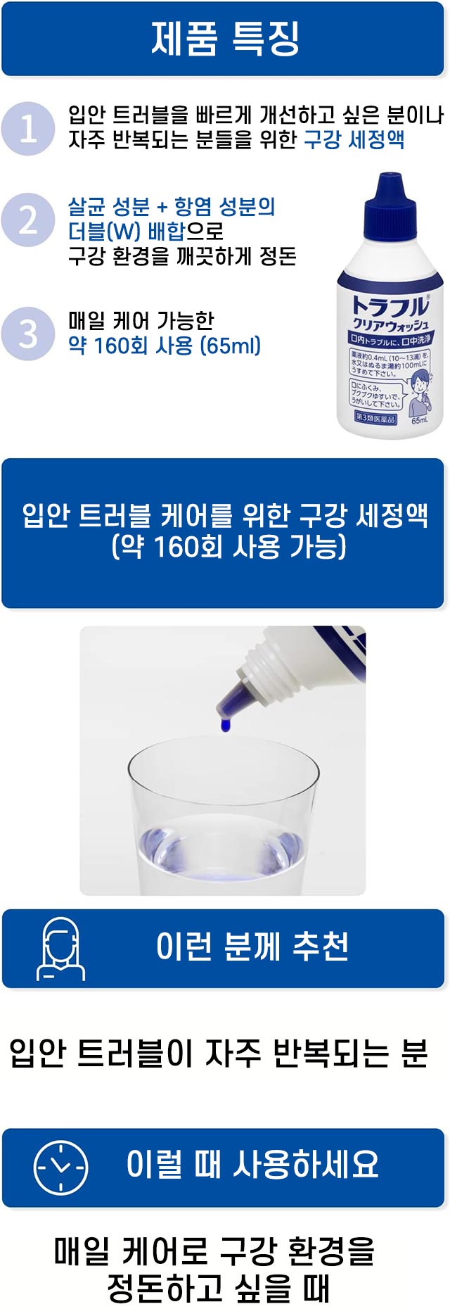 입안 트러블(구내염, 염증, 구취 등)을 케어하는 의약품 구강 세정액입니다. 살균 + 항염 더블 효과로 입안 환경을 깨끗하게 유지해줍니다. 🔹 상세 정보 ・내용량: 65ml ・품목명: 구강용 세정제 (제3류 의약품) ・패키지 크기: 약 11.5 x 4.8 x 4.8 cm ・원재료: 아줄렌설폰산나트륨, 세틸피리디늄염화물 등 ・원산지: 일본 🔹 보관방법 직사광선을 피하고 서늘하고 건조한 곳에 밀봉 보관 🔹 정보 ・상쾌한 멘톨 타입 → 깔끔하고 시원한 사용감 🔹 특징 ・살균 성분으로 구강 내 세균 억제 ・항염 성분으로 붓기 및 염증 완화 ・구내염, 입안 붓기, 구취 케어 가능 ・데일리 사용 가능한 구강 세정 타입 🔹 사용방법 ① 1회 약 0.4ml를 물 또는 미온수 약 100ml에 희석 ② 하루 여러 번 가글(입 헹굼) ③ 사용 후 뱉어내세요. (삼키지 마세요) ※ 원액 그대로 사용하지 말고 반드시 희석 후 사용하세요 🔹 사용상 주의사항 ・어린이는 보호자 지도 하에 사용 ・가글 용도로만 사용 ・사용 중 이상 증상 시 즉시 중단 후 상담 ⚠️ 주의사항 ・5~6일 사용 후에도 개선되지 않으면 전문가 상담 ・발진, 가려움, 자극감 발생 시 사용 중지 ・의사 치료 중이거나 알레르기 이력 있는 경우 상담 후 사용 ・화기 근처 보관 금지 및 다른 용기에 옮겨 담지 말 것
