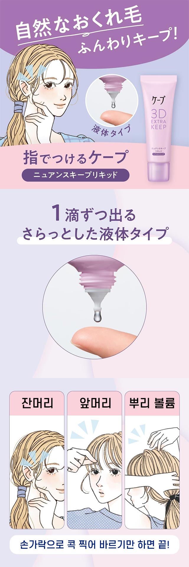 손가락으로 바르는 신개념 헤어 스타일링 제품으로, 잔머리·앞머리·뿌리 볼륨을 자연스럽게 고정해주는 리퀴드 타입입니다. 한방울로 잔머리, 앞머리, 뿌리 볼륨까지 OK! 손가락으로 간편하게 스타일링!! 🔹 상세 정보 ・내용량: 27ml ・품목명: 헤어 스타일링제 ・원재료: 에탄올, 아크릴계 폴리머, 유산 등 ・원산지: 일본
