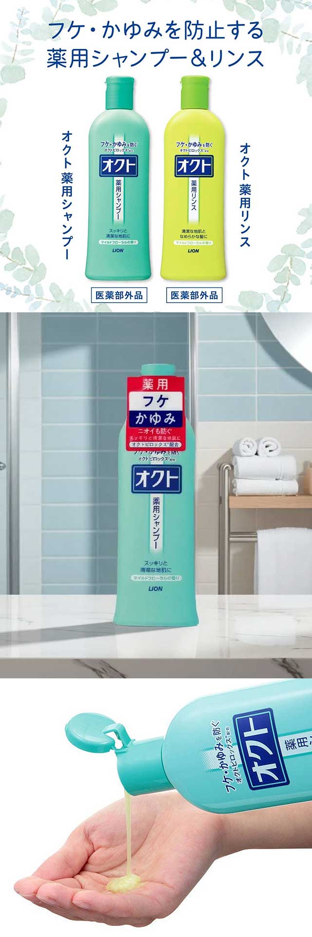 옥토피록스 성분이 함유된 약용 샴푸로, 두피를 깨끗하게 케어하고 비듬과 가려움을 예방해주는 데일리 스칼프 케어 샴푸입니다. 🔹 상세 정보 ・내용량: 320ml ・품목명: 약용 샴푸 ・원재료: 옥토피록스 등 ・원산지: 일본 🔹 정보 ・마일드 플로럴 향 – 부드럽고 은은한 꽃 향기 → 깔끔하고 상쾌한 두피 케어 감성