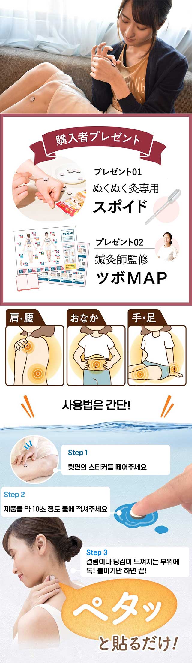 🔹 사용방법 사용법은 간단! ・Step 1 뒷면의 스티커를 떼어주세요 ・Step 2 제품을 약 10초 정도 물에 적셔주세요 ・Step 3 결림이나 당김이 느껴지는 부위에 톡! 붙이기만 하면 끝! 🔹 특징 ・불을 사용하지 않아 안전하고 간편한 사용 ・약 40~45℃의 온열로 부드럽게 자극 (약 3~5분 지속) ・하루 5분 간편 사용으로 꾸준한 셀프 케어 가능 ・혈자리 가이드북 포함으로 초보자도 쉽게 사용 ⚠️ 주의사항 ・열, 통증, 이상 증상이 느껴질 경우 즉시 제거해 주세요. ・피부가 약한 부위 사용 시 주의해 주세요. ・얼굴, 점막, 염증 부위에는 사용하지 마세요. ・임산부, 질환 치료 중인 분은 전문가와 상담 후 사용하세요. ・재사용 금지 제품입니다.