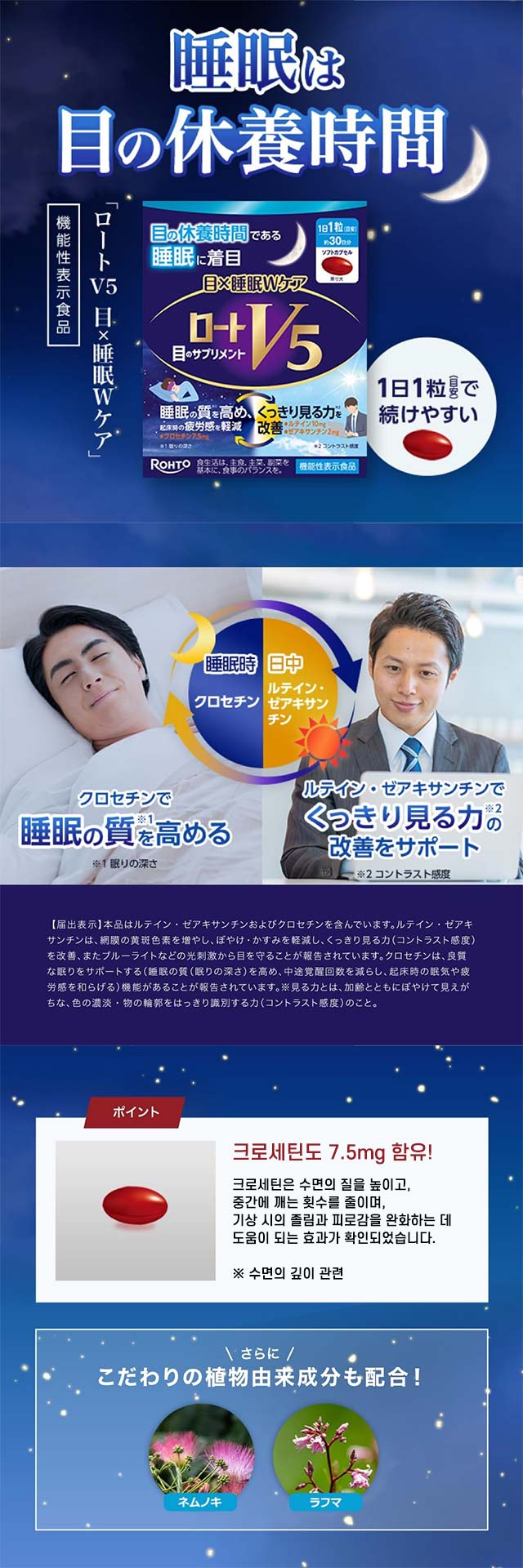 눈 건강과 휴식 시간을 함께 고려한 데일리 루테인 & 수면 케어 영양제!! 로토 V5 눈&수면 더블 케어는 눈의 휴식 시간인 ‘수면’에 주목한 제품입니다.