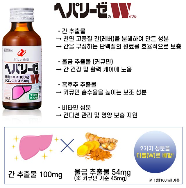 🔹 특징 ・간 추출물 + 울금 추출물 더블 배합 ・커큐민 흡수를 돕는 흑후추 추출물 함유 ・비타민 B군 함유로 컨디션 케어 지원 ・언제든 간편하게 섭취 가능한 리퀴드 타입