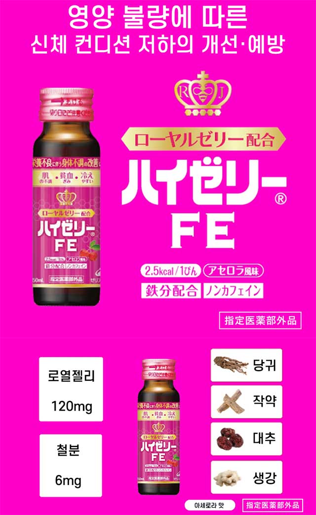 로열젤리와 4종 한방 생약, 철분, 비타민을 배합한 아세로라 맛의 기능성 드링크입니다. 일상 속 영양 부족으로 인한 피로, 컨디션 저하, 빈혈 경향 등을 케어해주는 제품입니다. 🔹 상세 정보 ・내용량: 50ml ・품목명: 자양강장 드링크 (지정 의약부외품) ・패키지 크기: (정보 없음) ・원재료: 로열젤리, 구연산철암모늄(철분), 글리신, 생강추출물, 작약추출물, 당귀추출물, 대추추출물, 비타민B2, 비타민B6, 니코틴산아미드 등 ・원산지: 일본