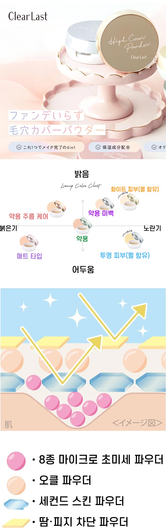 모공과 피부 결을 커버하면서 자연스럽고 고급스러운 윤광 피부를 연출하는 하이커버 페이스 파우더. 파운데이션 없이도 반짝이는 ‘글로우 피부’를 완성하는 4in1 멀티 베이스 제품.