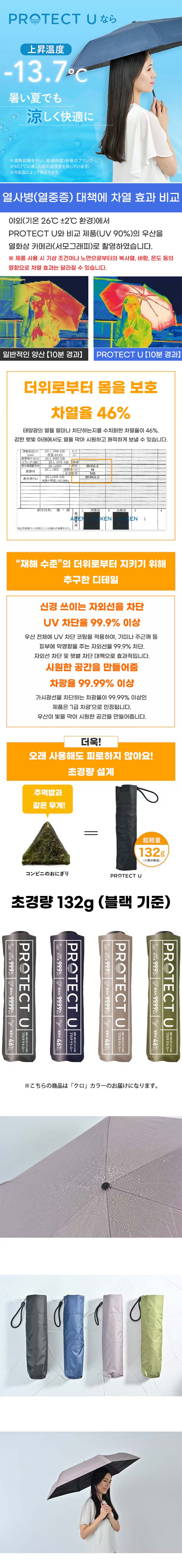 프로텍트유 PROTECT U 접이식 양산 겸 우산 50cm 수동식 1급 차광 UV차단 99.9% 차열 내부 블랙 코팅 6본살 경량 단순한 양산이 아닌, 열사병까지 대비하는 기능성 양산. 기온 상승을 억제하여 체감 온도를 낮추고, 강한 햇빛 아래에서도 시원하고 쾌적하게 사용할 수 있는 초경량 접이식 우산입니다. 🔹 상세 정보 ・품목명: 양산 겸용 우산 ・패키지 크기: W40 × H210 × D40mm / 132g ・원재료: 폴리에스터 100% ・원산지: 중국 🔹 보관방법 직사광선 및 고온다습한 장소를 피해 보관하며, 사용 후에는 충분히 건조 후 보관
