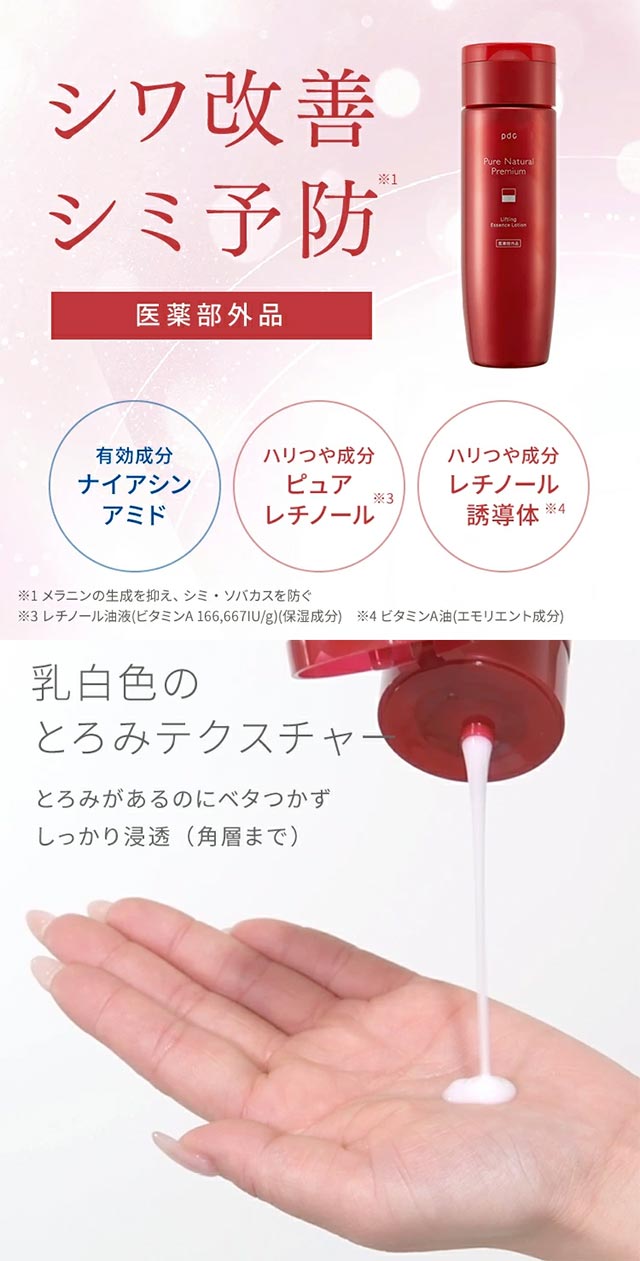 화장수와 에멀전 기능을 하나로 담은 올인원 로션으로, 피부에 수분과 영양을 동시에 공급하며 링클 케어와 화이트닝 케어를 도와주는 제품입니다. 🔹 상세 정보 ・내용량: 150ml ・품목명: 에센스 로션 ・패키지 크기: 약 15.2 × 4.8 × 4.7cm ・원재료: 나이아신아마이드, 정제수, BG, 에틸헥실팔미테이트, 농글리세린, 레티놀 오일, 비타민A 오일, 펩타이드, 판테놀, 세라마이드 복합체, 피토스테롤, 스타프루트 잎 추출물, 멜리사 추출물, 알로에 추출물, 히알루론산Na, 가수분해 히알루론산, 아미노산 복합체, 트라이메틸글리신, 기타 보습 성분 등 ・원산지: 일본