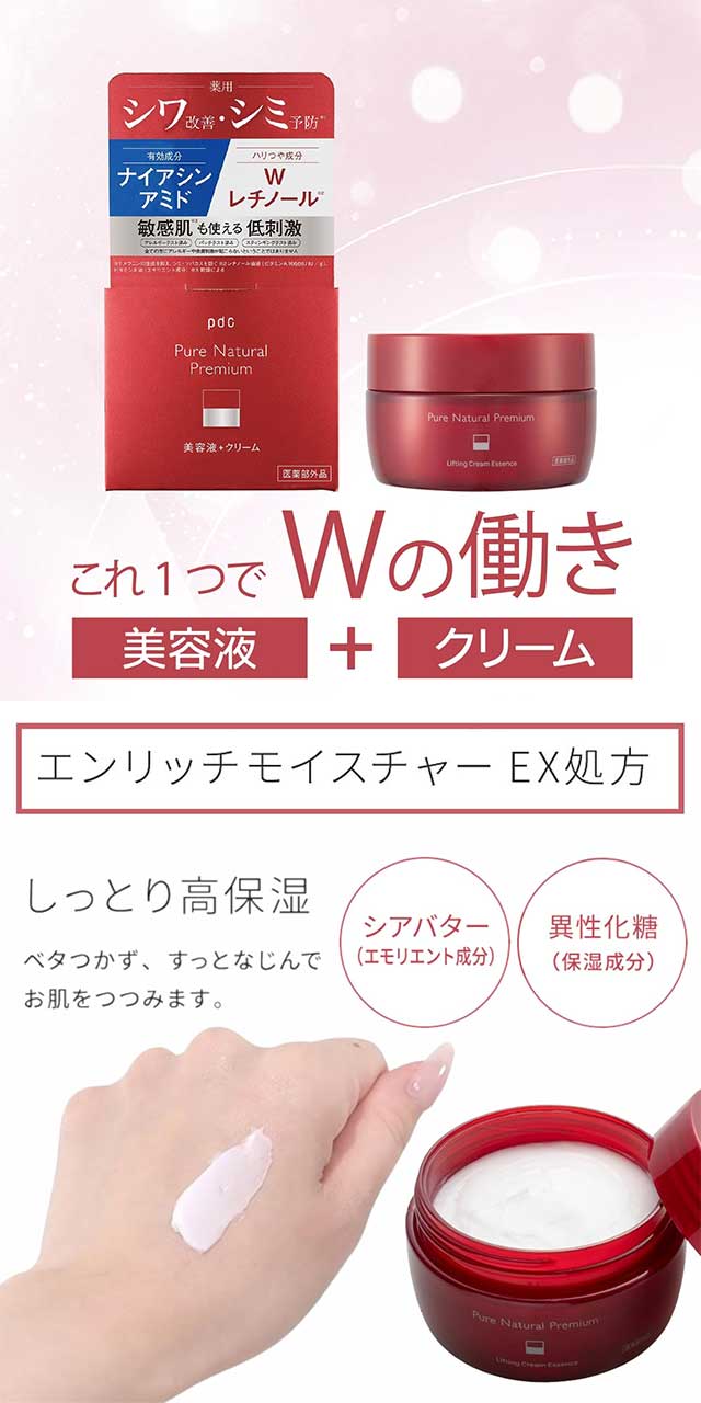 에센스와 크림을 하나로 담은 올인원 제품으로, 피부에 깊은 보습과 영양을 공급하며 링클 케어와 화이트닝 케어를 동시에 도와주는 기능성 케어 크림입니다. 🔹 상세 정보 ・내용량: 60g ・품목명: 보습 크림 (크림 에센스) ・패키지 크기: 약 6.9 × 6.8 × 5.9cm ・원재료: 나이아신아마이드, 레티놀, 세라마이드, 판테놀, 펩타이드, 스타프루트 잎 추출물, 멜리사 추출물, 히알루론산 등 보습 성분 ・원산지: 일본