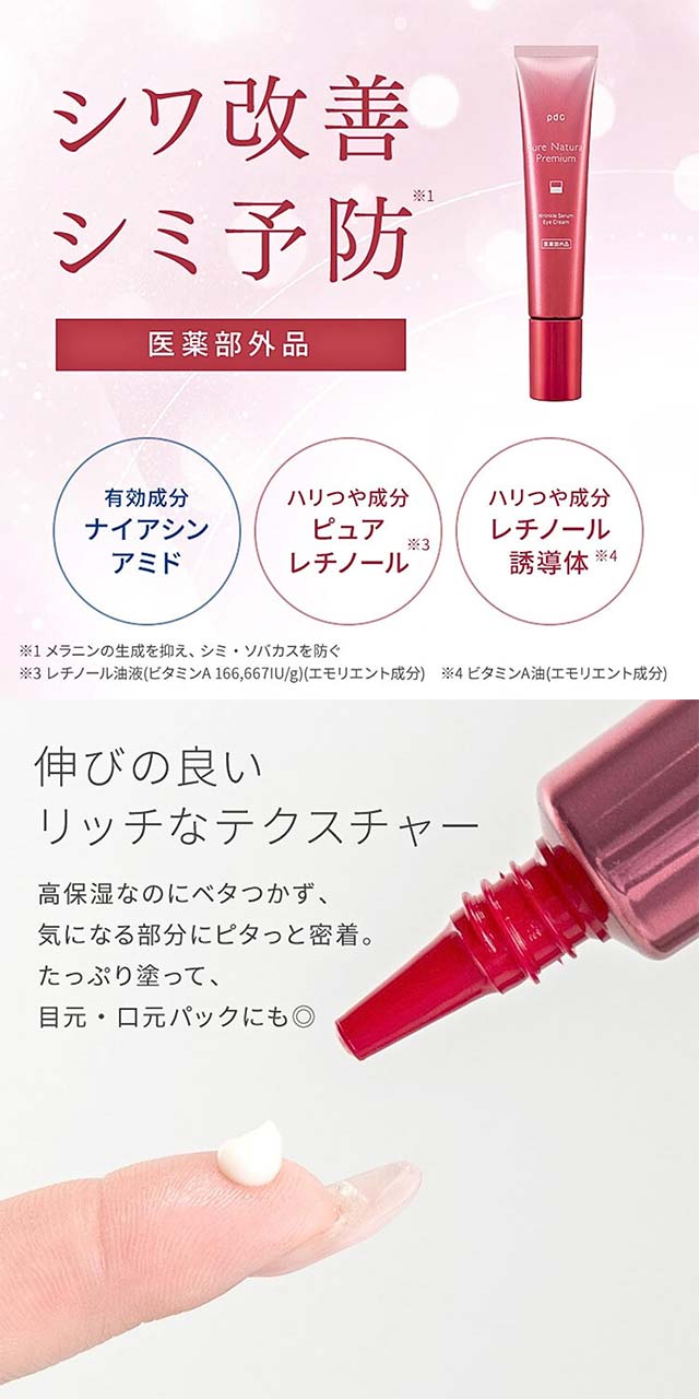 🔹 특징 ・나이아신아마이드 함유로 링클 케어 & 화이트닝 케어 ・W 레티놀 함유로 탄력감 있는 눈가 피부 컨디션 케어 ・세라마이드 + 히알루론산으로 눈가 집중 보습 ・무향료 / 무착색 / 알코올 프리 / 저자극 설계