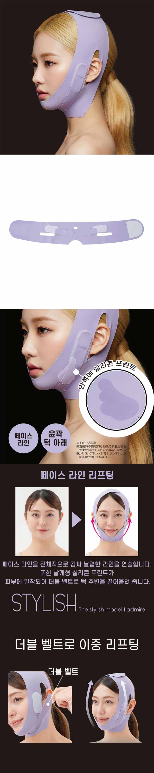 🔹 특징 ・더블 벨트로 턱 라인 집중 리프팅 ・실리콘 프린트로 밀착력 강화 ・부드럽고 신축성 있는 소재로 편안한 착용감 ・스마트폰, TV 시청 등 ‘하면서 케어’ 가능